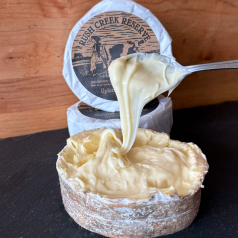 Rush Creek Reserve is a seasonal cheese inspired by the French Vacherin Mont d' Or. It is a washed rind cheese with a milder but more complex flavor enhanced by its spruce bark. It is woodsy, bacony, with hints of smokiness. The texture is luxurious. It's pudding-like, and silky smooth, and made for scooping. Cheesemaker Andy Hatch uses raw winter milk from his herd of cows making this a seasonal gem. It is sold by the piece, each weighing about 12 ounces.